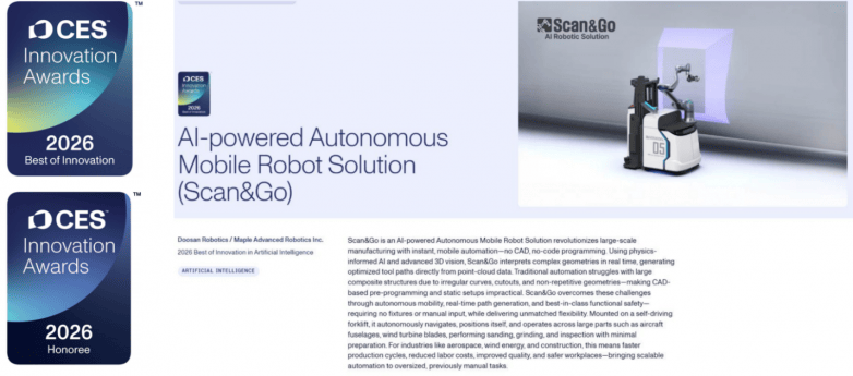 2026 年国际消费电子展(CES)的聚光灯聚焦拉斯维加斯会展核心,工业机械人 AI 范畴降生核心时辰 —— 源自和意精工的 AARS(自从自顺应机械人系统)手艺,联袂合做伙伴斗山机械人(Doosan Robotics),一举斩获 CES 2026 “人工智能” 类别 “最佳立异” ,同时入选 “机械人” 类别立异荣誉名单,成为本届 CES 独一正在双焦点赛道获的工业机械人智能化手艺!
